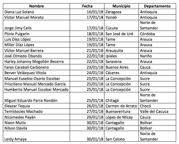 Sólo en el martes 30 de enero fueron asesinados tres de ellos: Nixon Mutis y Nilson Dávila en Cantagallo (Bolívar) y Leidy Amaya en San Calixto (Norte de Santander).