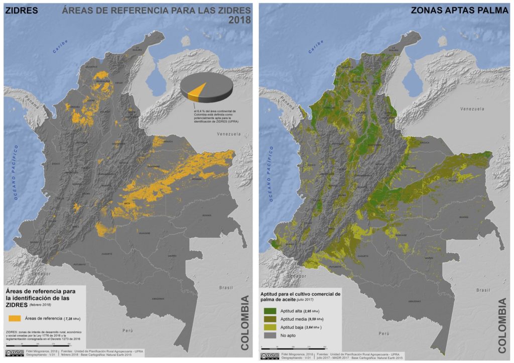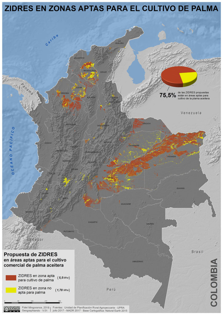La teoría es la siguiente: las ZIDRES deben desarrollarse en zonas aisladas, sin infraestructuras, de alta pobreza y donde el desarrollo agrícola endógeno no es posible. La realidad es que, a pesar de las restricciones impuestas por la Corte Constitucional, el Conpes 3917 atenta directamente contra los territorios y sus habitantes. Y algo más… de las 7.2 millones de hectáreas que, según la Unidad de Planificación Rural Agropecuaria (UPRA), están en estas malas condiciones y son susceptibles de desarrollar ZIDRES, el 75.5% (5.5 millones de hectáreas) corresponden de forma milimétrica con las áreas aptas para el cultivo de palma africana. El Gobierno insiste demasiado en que esas 7.2 millones de hectáreas suman poco más del 6% del territorio nacional, pero su inclusión como ZIDRES supondría doblar el territorio sembrado del país. No es poca cosa.